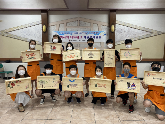 부산 중구 자원봉사센터는 최근 해운대 우동성당 청년회 ‘우리들의 동그라미’ 봉사단과 목공쟁반찻상을 만들어 열악한 환경에서 식사하는 어르신들에게 전달했다.