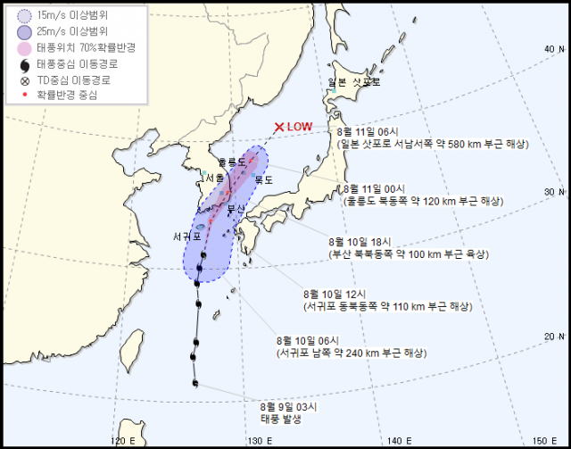 태풍은 10일 정오 서귀포 동북동쪽 약 110km 부근 해상을 지나 18시 부근 부산 북북동쪽 약 100km 부근 육상을 지난다. 이후 11일 울릉도 북동쪽 약 120km 부근 해상을 지나 일본 삿포로 서남서쪽 약 580km 부근 해상을 지나게 된다.
