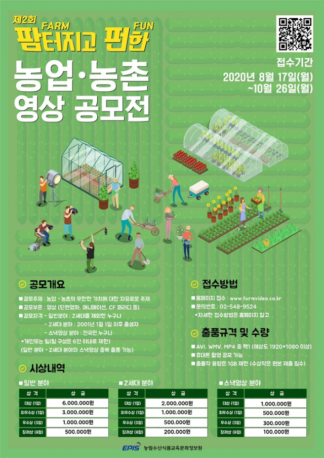 농림수산식품교육문화정보원은 국민 누구나 참가할 수 있는 ‘제2회 팜(FARM)터지고 펀(FUN)한 농업 농촌 영상 공모전’을 오는 10월 26일까지 진행한다고 21일 밝혔다.
