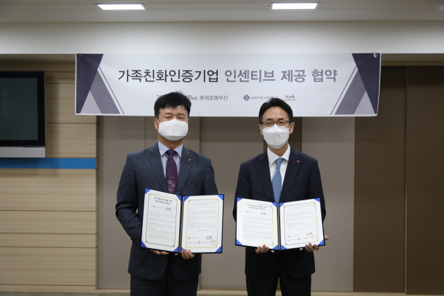 (주)부산롯데호텔(대표이사 김성한)과 부산시 일·생활균형지원센터(센터장 변상준·왼쪽)는 부산지역 가족친화인증기업에 대한 객실 패키지 5%, 레스토랑 메뉴 10% 할인 혜택을 제공하기로 협약했다.
