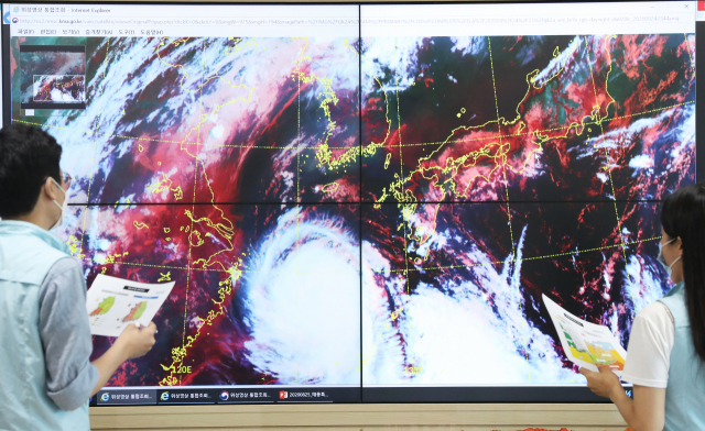 제8호 태풍 '바비'가 북상하고 있는 25일 오전 경기도 수원시 권선구 수도권기상청에서 예보관들이 태풍 경로 등 기상 상황을 살펴보고 있다. 연합뉴스