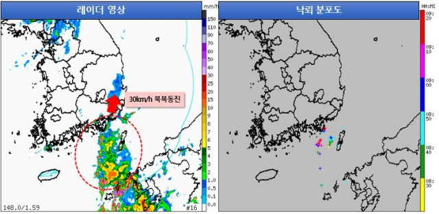 27일 오전 9시 20분 기준 레이더 영상과 낙뢰 분포도. 부산기상청 제공