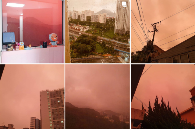 태풍 '바비'의 영향으로 강한 바람과 비가 휘몰아친 부산 하늘이 아침 한때 주황빛으로 물들어 화제가 됐다.