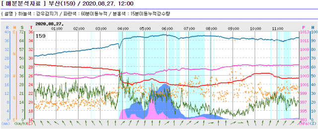 7년 전 대구에서도 한 시간 동안 10mm가 넘는 강한 비가 쏟아지자 습도가 급격하게 높아졌다. 대기 중에 수증기가 포화된 상태에서 해가 지는 시간까지 겹치자 빛의 산란이 더욱 많이 발생해 하늘이 주황빛으로 보이게 된 것이다. 오늘 27일 부산의 아침 날씨 역시 이 같은 조건을 만족한다. 오전 3시 30분께부터 비가 내리기 시작해 이날 일출시간인 오전 5시 53분까지 부산 지역에는 평균 10mm 내외의 비가 내렸다. 특히 부산 중구 기상대에서는 시간당 16mm에 이르는 강한 비가 쏟아졌고, 습도 역시 79%에서 92%까지 치솟았다. 부산의 다른 기상관측소에서 측정된 습도 역시 오전 6시 30분께 모두 90%를 넘었다.