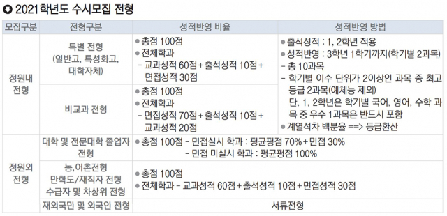 성적 반영은 학교생활기록부 교과성적과 출석성적을 반영하며, 학생부 성적은 3학년 1학기까지 학기별 2과목(총 10과목) 이수단위 2이상인 과목(예·체능 제외)을 반영하며 1, 2학년은 학기별 국어, 영어, 수학 과목 중 우수 1과목은 반드시 반영한다.