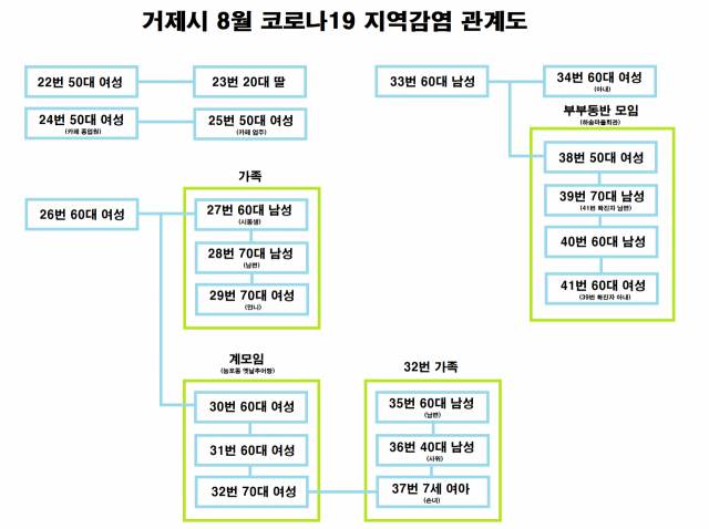 33번은 연초면에 사는 60대 남성이다. 지난 20일 기침과 몸살 기운이 나타나 25일까지 의원 2곳을 다녔지만 차도가 없었고, 26일 열이 38.2도까지 오르자 보건소 선별진료소에서 검사를 받았다. 이 남성은 증상이 있던 20일 오후 마을회관에서 동네 주민 30명과 저녁 식사를 겸한 부부동반 모임을 했는데, 동석한 4명도 확진됐다.