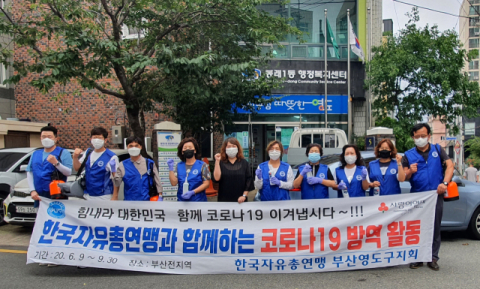 한국자유총연맹 부산영도구지회는 8월 31일 봉래1동행정복지센터 앞에서 10여 명의 회원들이 집결한 가운데 코로나19 확산 방지를 위한 관내 방역활동을 펼쳤다.
