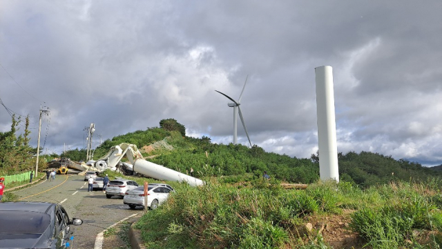 사고가 나자, 양산시와 원드밀파워㈜ 등은 이날 오전부터 도로에 넘어진 풍력발전기를 옮기기 위해 작업을 진행 중이다.
