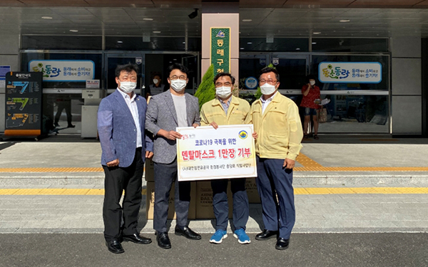부산 동래구(구청장 김우룡)는 지난 3일 (사)대한참전유공자 환경봉사단 중앙회 직할사업단(단장 김동수)로부터 코로나19 감염 예방을 위한 덴탈마스크 1만장을 지원받았다. 지원 받은 덴탈마스크는 코로나19 감염 예방을 위해 저소득 취약계층에게 전달할 계획이다.