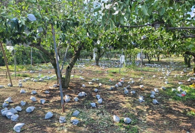 지난 2일 제9호 태풍 '마이삭'이 몰고 온 '역대급' 강풍 때문에 울산 대표 과일인 배가 추석 명절 수확을 앞두고 역대 최대 규모의 낙과 피해를 당했다. 연합뉴스