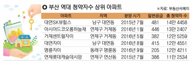 지금까지 부산지역 분양 단지 중 청약자 수가 가장 많았던 아파트는 2015년 7월에 분양한 ‘대연SK뷰힐스’다. 481세대 모집에 1순위 청약에서 14만 4458명이 몰렸다. 올해는 지난달 분양한 ‘대연푸르지오클라센트’가 352세대 모집에 5만 5483개의 청약통장이 접수돼 ‘최고 흥행’을 기록했다. 부산의 1순위 청약통장 가입자 수는 7월 말 기준으로 85만 5604명이다. 박태우 기자 wideneye@