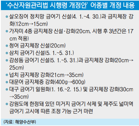 또 개정안은 살오징어, 가자미, 삼치, 넙치, 대문어 등 13개 어종에 대해서도 금어기와 금지체장을 신설하거나 강화했다. 대표적으로 살오징어 금어기는 4월 한 달간으로 새로 정하고, 금지체장을 기존 12cm에서 15cm로 확대했다. 대문어 금지체중도 400g에서 600g으로 늘렸고, 청어는 금지체장(20cm)이, 삼치는 금어기(5월)가 신설됐다.