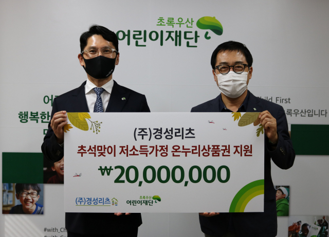 (주)경성리츠(대표 채창일·어린이재단 부산후원회장)는 지난 21일 초록우산 어린이재단(부산지역본부장 여승수)에 온누리상품권 2000만 원을 지원하는 전달식을 가졌다.