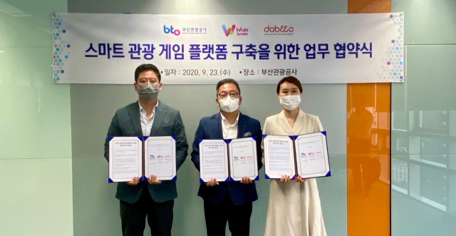 부산관광공사는 인공지능 기반 실내지도 기술 보유기업 ㈜다비오(대표 박주흠)와, AR 콘텐츠 기업 ㈜와이드브레인(대표 정혜원)과 초고속망을 활용한 스마트 관광게임 플랫폼의 초석을 다지는 업무협약을 지난달 23일 체결했다.