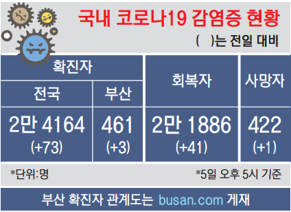 5일 부산에서는 북구 그린코아목욕탕 관련 접촉자 1명을 포함해 3명이 추가로 확진됐다. 459번(북구) 확진자는 그린코아목욕탕 방문자(412번)의 자녀로, 북구 A유치원생이다. 형제인 백양초등 1학년(415번)이 지난달 29일 확진된 직후 검사에서 음성 판정을 받고 자가격리 중 확진됐다. 유치원에는 지난달 28일까지 등원했다.
