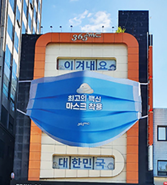 코로나 시대 사회 곳곳에서 감염 예방을 위한 방역 활동에 힘쓰는 중 서울 강남의 한 빌딩이 대형 마스크를 써서 화제다. 이는 코로나 19 감염 예방을 위한 365mc 사회공헌의 일환으로 서울 365mc 강남본점 외벽에 설치되어 있다.