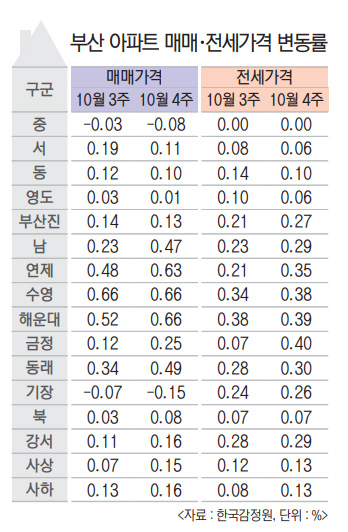 한국감정원은 “해운대구는 0.66%가 올랐는데 우·좌·재송동 등 입지여건 우수한 곳 위주로, 수영구(0.66%)는 망미·광안동 등과 수영동 재건축단지 위주로 올랐다”며 “연제구(0.63%)는 거제·연산동 신축 위주로, 동래구(0.49%)는 개발사업 기대감이 있는 단지 위주로 상승했다”고 밝혔다. 이 밖에 남구도 0.47%가 올라 상승폭이 컸다.
