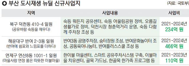 부산 북구 덕천동 숙등마을 일원과 정책이주지였던 해운대구 반여동, 연제구 연산동 이불마을이 도시재생 뉴딜 신규 사업지로 뽑혔다.