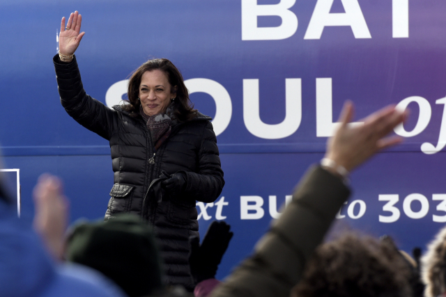 카멀라 해리스 미국 민주당 부통령 후보가 대선을 하루 앞둔 2일(현지시간) 펜실베이니아주 피츠턴에서 열린 유세에서 지지자들을 향해 손을 흔들고 있다. 연합뉴스