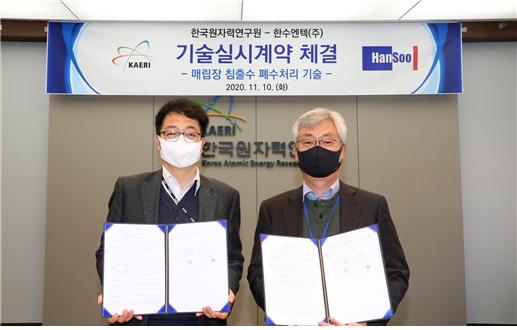 한국원자력연구원은 10일 ‘간헐 폭기 공법을 이용한 미생물 침출수 정화기술’을 한수엔텍㈜에 기술이전했다(왼쪽부터 임채영 원자력연구원 미래전략본부장, 이진구 한수엔텍 대표). 원자력연구원 제공