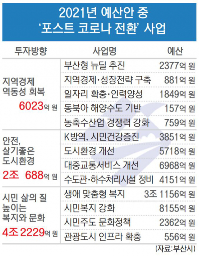 부산시는 미래 먹거리 개발을 통해 경제를 활성화하고 재해 예방으로 안전 도시를 만드는 데 초점을 맞췄다. 이 같은 내용을 포함한 2021년 예산안을 시의회에 전달했다.