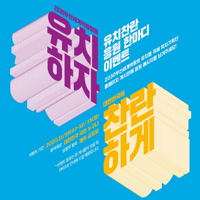 이와 함께 유치기획단 홈페이지 게시판에 부산 세계박람회 유치응원 메시지를 남기는 이벤트도 18일부터 12월 15일까지 진행된다. 홈페이지 응원 게시판에 유치응원 메시지를 남기고 유치기획단 페이스북이나 인스타그램 이벤트 게시물에 ‘참여 완료’를 댓글로 남기면 참여가 가능하다.