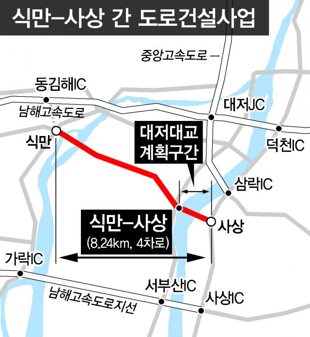 식만~사상 간 도로는 강서구 식만동 식만JCT와 사상구 삼락동 사상공단을 잇는 길이 8.24km의 4차로 도로다. 부산의 5번째 동서축 간선도로망(식만~사상~하마정) 중 일부다. 서낙동강과 낙동강을 지난다. 낙동강을 건너는 다리가 바로 대저대교(1835m)다. 당초 사업기간은 2014년부터 2024년까지였다. 총 공사비는 3956억 원이다.