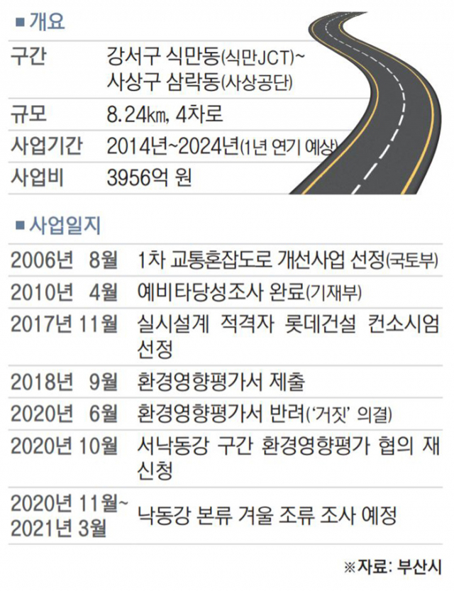 지난달 부산시는 서낙동강 구간에 대한 환경영향평가 협의를 낙동강유역환경청에 다시 신청했다. 공구를 2개로 나눠 대저대교 구간을 뺀 나머지 서낙동강 구간(식만JCT~평강교차로·4km)에 대해 1단계로 환경영향평가 절차를 밟고 공사를 진행하겠다는 것이다. 이어 2단계로 낙동강 본류 겨울 철새에 대한 공동조사를 내년 3월까지 실시할 계획이다.