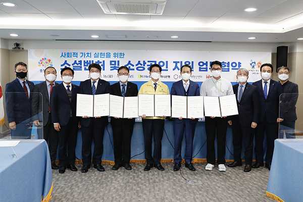 기술보증기금(이사장 정윤모, 이하 ‘기보’)은 충청남도(도지사 양승조, 이하 ‘충남도’), 하나은행(은행장 지성규), 충남창조경제혁신센터(센터장 강희준, 이하 ‘충남창경센터’), ㈜백패커(대표이사 김동환, 이하 ‘백패커’)와 16일 충남 홍성군 소재 충청남도청 회의실에서 「사회적가치 실현을 위한 소셜벤처 및 소상공인 지원 업무협약」을 체결하고, 사회적가치 창출에 앞장서는 소셜벤처 육성과 소상공인의 판로 지원에 적극 협력하기로 했다.