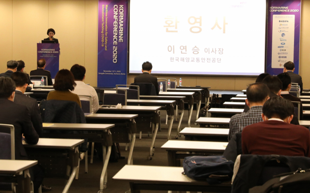 이연승 한국해양교통안전공단(KOMSA) 이사장이 지난 12일 인천 송도컨벤시아에서 열린 ‘2020 코마린 컨퍼런스’에 참석, 공단의 환경친화적 선박 및 기자재 인증제 업무를 소개하고, 환영사를 전하고 있다. KOMSA 제공