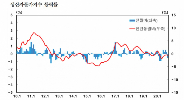 10월 생산자물가지수는 1년 전과 비교하면 0.6% 낮아졌다. 특히 코로나19 사태 여파로 수요가 위축되면서 석탄·석유제품 물가가 30.7%나 떨어졌다. 하지만 농산림수산품의 경우 1년 전보다 12.3% 높은 수준이다.
