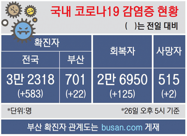 코로나19 확산세가 무섭다. 26일 전국의 신규 확진자는 전날보다 201명 폭증한 583명을 기록했다. 올 3월 이후 최대 규모다. 부산도 이틀 연속 신규 확진자가 20명대를 기록해 부산시는 2단계에 준하는 사회적 거리 두기를 실시한다.