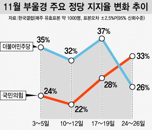 일주일 새 민주당 11%P나 빠지며 역전