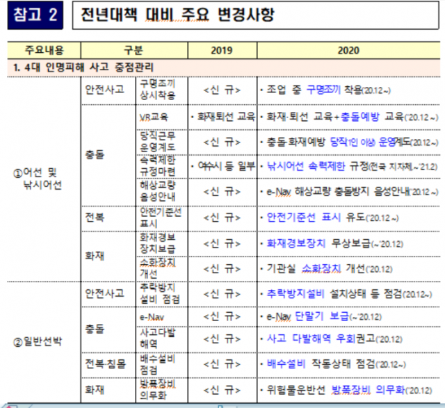 아울러 해수부는 강풍이 불거나 파도가 높은 등 기상 상황이 좋지 않을 때는 선박에 대한 출항통제를 더욱 철저히 할 계획이다.
