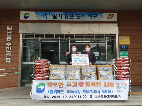 ㈜송도해상케이블카(대표 최효섭)는 2일, 저소득 주민들이 따뜻한 겨울을 보낼 수 있게 전기매트 40세트와 백미10kg 60포(350만원 상당)를 암남동주민센터에 기탁했다.