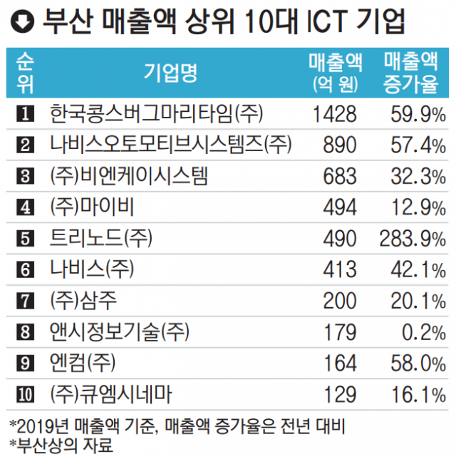 부산 ICT 산업 10대 기업(2019년 매출 기준) 면면을 보면 한국콩스버그마리타임(주)(전국 순위 107위), 나비스오토모티브시스템즈(주)(163위), (주)비엔케이시스템(196위), (주)마이비(265위), 트리노드(주)(267위)(이상 전국 300위권 이내), 나비스(주), (주)삼주, 앤시정보기술(주), 엔컴(주), (주)큐엠시네마 등이다.