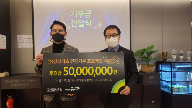 (주)경성리츠(대표 채창일·왼쪽)는 최근 ‘제5회 365 건강기부 올집 프로젝트’로 마련한 후원금 5000만 원을 초록우산 어린이재단 부산지역본부(본부장 여승수)에 전달했다.