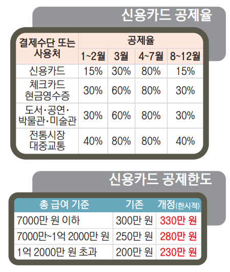 코로나19의 영향으로 소비가 위축되면서 정부는 소비 촉진을 위해 카드 소득공제율을 일시적으로 높였다. 기존 소득공제율은 신용카드가 15%, 체크카드·현금이 30%였다. 전통시장이나 대중교통으로 사용한 돈은 40%를 공제해준다. 그런데 코로나19 발발 초기였던 3월 한 달간 공제율을 배로 늘였다. 코로나19의 장기화로 4~7월에는 일괄 80%까지 올랐다가, 8월부터 기존 수준으로 돌아왔다.