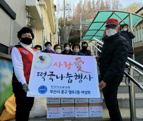 부산 중구 영주2동 자유총연맹여성회(회장 김남득)는 연말연시를 맞아 13일 관내 취약계층 및 독거노인가구 20세대에 떡국떡을 전달했다.