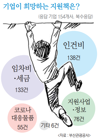 업계에서는 실질적 지원책을 요구하고 있다. 정부가 임대료, 인건비 등 고정비를 지원하고 대출 기준을 확대하는 방안이 대표적이다. 실제로 부산관광공사의 ‘2020 코로나19 이후 부산 관광수요 예측 조사’에서 기업의 42.4%가 당장 필요한 정부 지원책으로 ‘기업 운영자금 지원’을 꼽았다. 또 고용유지 지원 제도 개선(22.5%), 세제 감면 또는 납부 유예(14.9%) 순이었다.