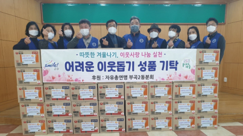 자유총연맹 부곡2동분회(위원장 박진규)는 11일 부산 금정구(구청장 정미영) 부곡2동에 어려운 이웃을 위한 라면 40박스(100만 원 상당)를 기탁했다. 매년 연말 저소득 어르신들에게 식사를 대접하고 선물을 전달했으나 올해는 코로나19 확산 방지를 위해 성품 전달로 대체하게 됐다.
