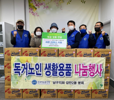 부산 남구 감만2동 자유총연맹(회장 김성율)은 15일 복지사각지대 주민 25세대에게 라면 25박스(약 60만원 상당)를 전달했다.
