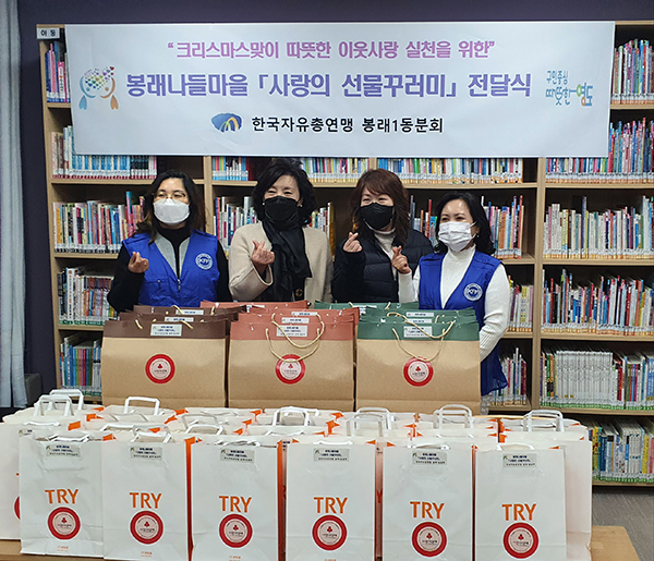 영도구 한국자유총연맹 봉래1동분회(위원장 주오수)는 12월 23일 크리스마스를 맞이하여 관내 취약계층을 대상으로 봉래나들마을 「사랑의 선물꾸러미」전달식을 가졌다.