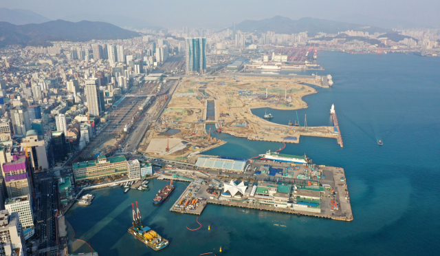 새해에는 부산항 북항 1단계 재개발 사업현장에서 시민들이 오가는 모습을 만날 수 있다. 부산역에서 북항으로 접근하는 보행덱과 일부 친수공간이 7월에 가장 먼저 문을 연다. 상공에서 촬영한 북항 1단계 사업 현장. 김경현 기자 view@