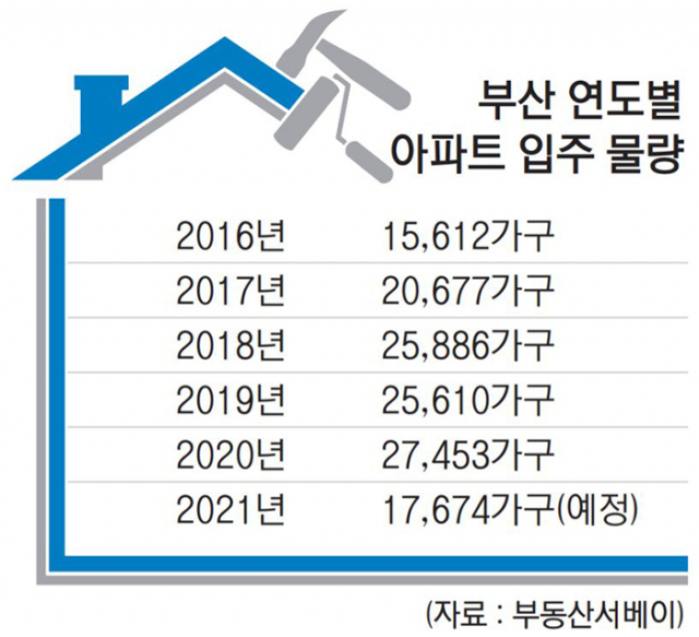부산의 입주 물량은 2017년 2만 677가구를 시작으로 2018년 이후엔 매년 2만 5000여 가구를 상회하면서 증가세를 보였지만, 올해 대폭 감소하면서 2016년(1만 5612가구) 이후 5년 만에 최저치를 기록할 전망이다.