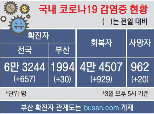 부산시는 3일 코로나19 신규 확진자가 30명으로 누적 확진자는 1994명이라고 밝혔다. 이날 신규 확진자 가운데 영도구 파랑새노인건강센터에서 나온 환자는 입소자 6명과 직원 2명이다. 이로써 지난달 29일 첫 확진자가 나온 파랑새노인건강센터 관련 누적 확진자는 66명으로 늘었다.
