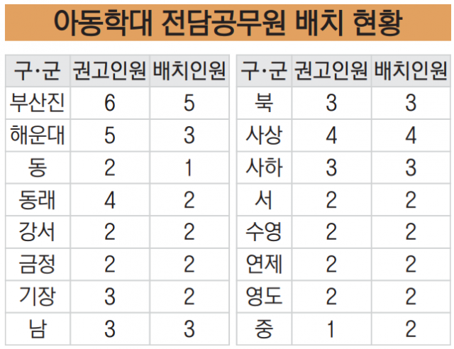 속보=전담공무원의 전문성 부족으로 아동학대 관리가 허술(부산일보 7일 자 10면 보도)할 뿐만 아니라 일부 기초지자체의 담당 인력 수가 적정 규모에 턱없이 모자란 것으로 드러났다.