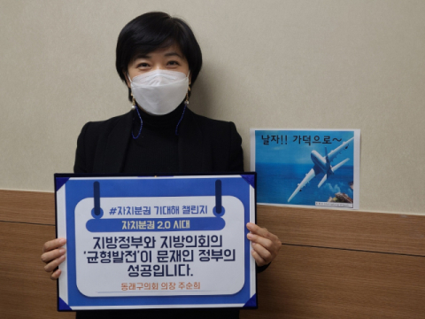 부산광역시 동래구의회 주순희 의장은 지난 8일 ‘자치분권 기대해 챌린지’에 동참했다고 11일 밝혔다. ‘자치분권 기대해 챌린지’는 지난해 12월 9일 지방자치법 전부개정(안)이 국회를 통과함에 따라 대통령 소속 자치분권위원회의 주민중심 자치분권 실현에 대한 관심과 인식을 확산하기 위해 시작됐으며 32년 만에 개정된 지방자치법과 75년 만에 실시되는 자치경찰제로 획기적인 지방자치 변화가 기대되고 있다.