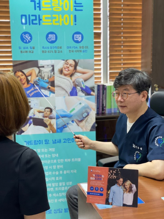 피부가 건조해지는 추운 겨울철 피부소양증, 지루성 피부염, 액취증 등 각종 피부질환에 주의해야 한다. 남포고운피부과 이흥렬 원장이 피부질환을 앓는 환자를 시술하고 있다. 작은 사진은 액취증에 관해 상담하는 모습. 남포고운피부과 제공
