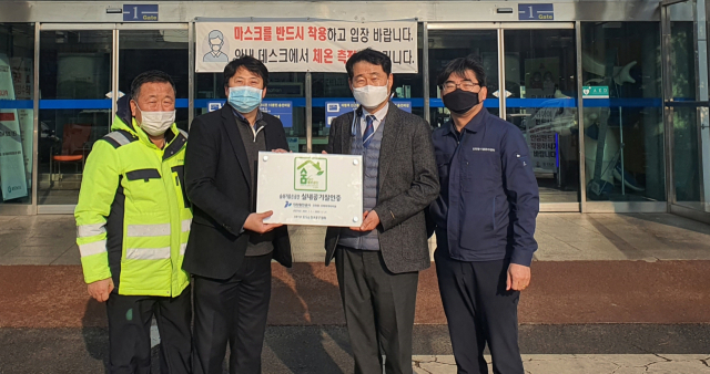 IPFC 관계자와 실내공기질 인증 현판과 함께 사진촬영을 하고 있다(왼쪽 두 번째 인천항만공사 김성철 항만환경부장). 인천항만공사 제공